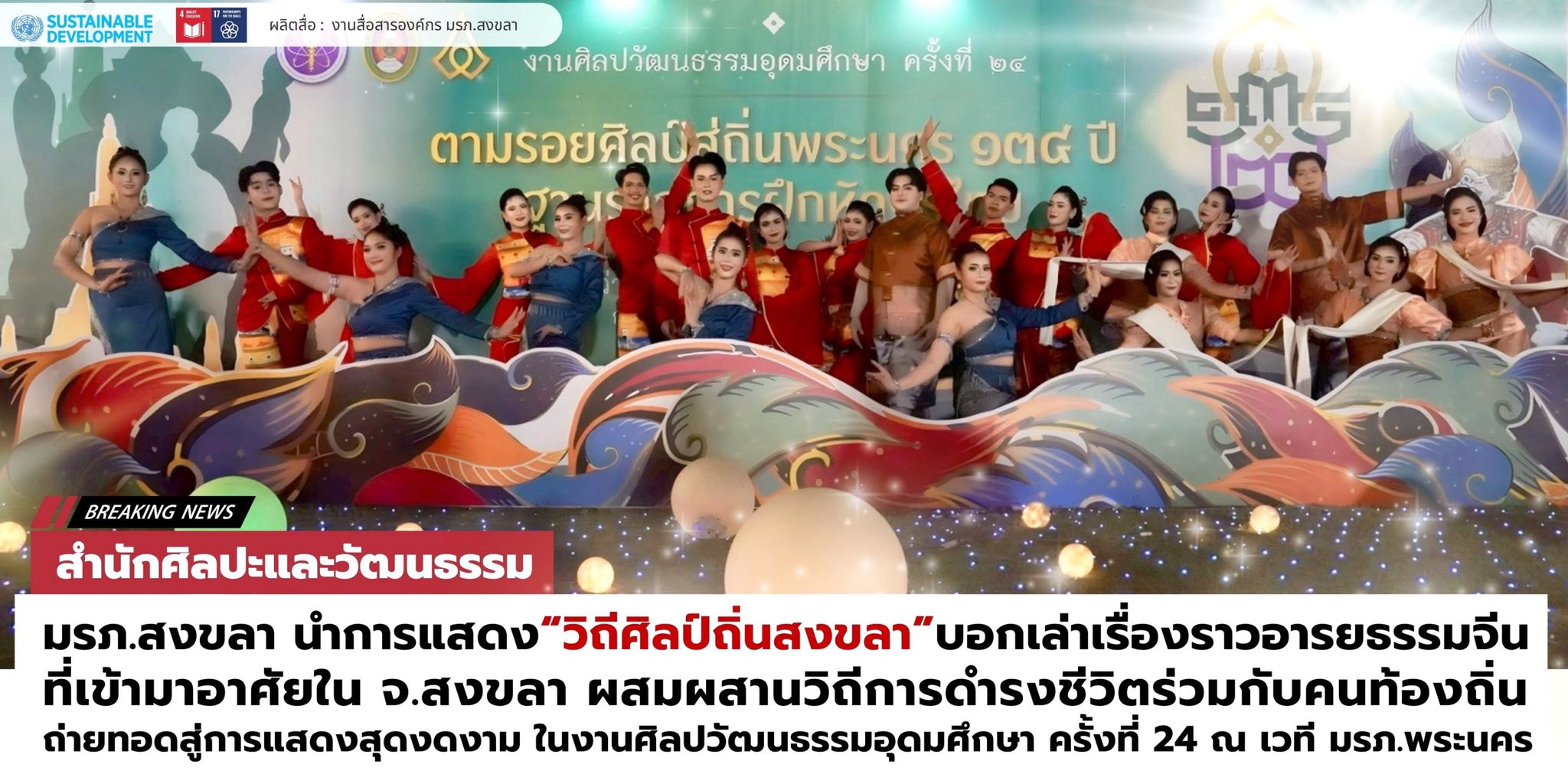 สำนักศิลปะและวัฒนธรรม มรภ.สงขลา นำการแสดง “วิถีศิลป์ถิ่นสงขลา” บอกเล่าเรื่องราวอารยธรรมจีนที่เข้ามาอาศัยใน จ.สงขลา ผสมผสานวิถีการดำรงชีวิตร่วมกับคนท้องถิ่น ถ่ายทอดสู่การแสดงสุดงดงามในงานศิลปวัฒนธรรมอุดมศึกษา ครั้งที่ 24 ณ เวที มรภ.พระนคร