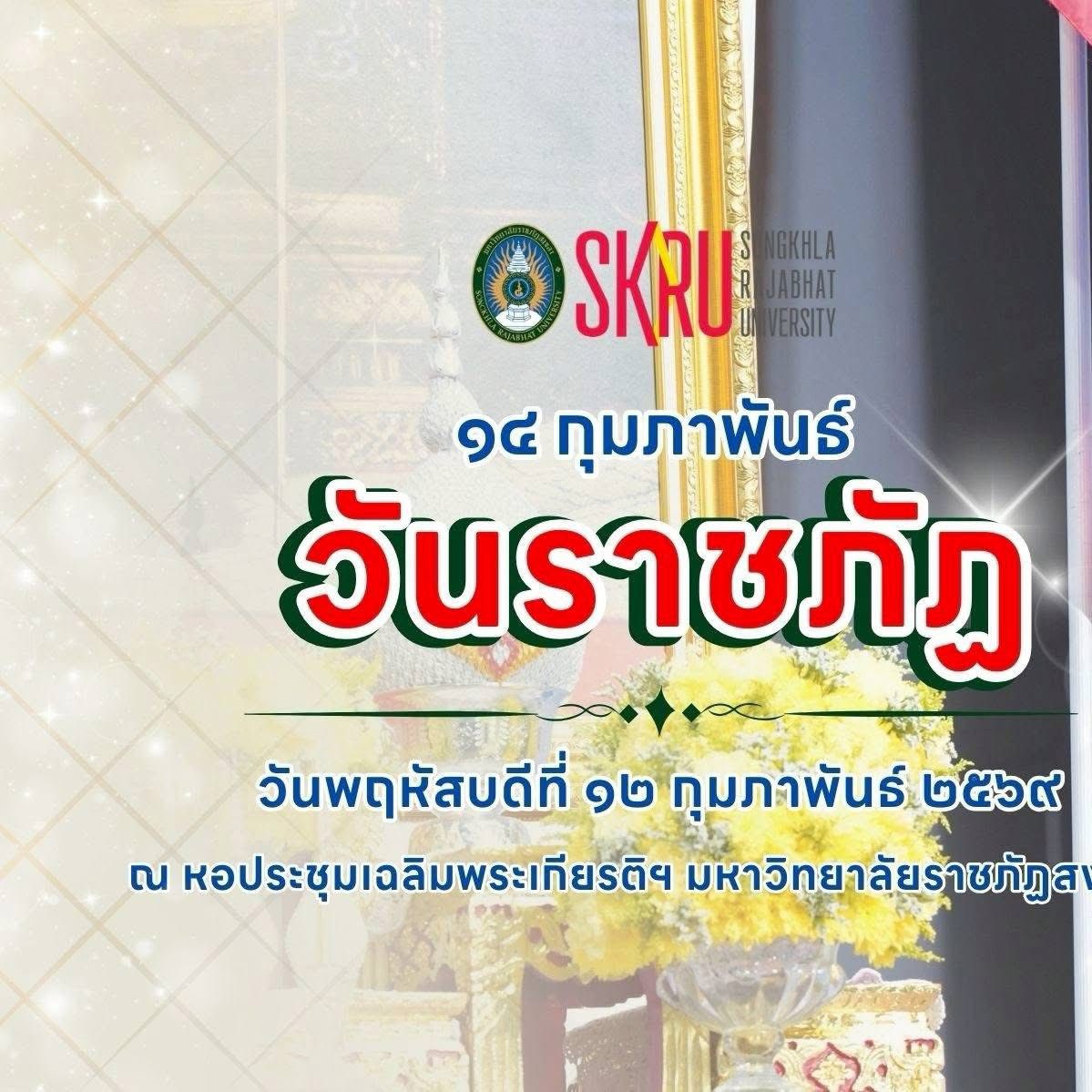 เมื่อวันที่ 12 กุมภาพันธ์ 2569 มหาวิทยาลัยราชภัฏสงขลา (มรภ.สงขลา) จัดงานวันราชภัฏ (14 กุมภาพันธ์) ประจำปี 2569 ระหว่างวันที่ 9-12 กุมภาพันธ์ 2569 ณ ห้องประชุมชั้น 3 อาคารศูนย์รวมกิจการนักศึกษา และหอประชุมเฉลิมพระเกียรติฯ มรภ.สงขลา โดยได้รับเกียรติจาก ผศ.พิเชษฐ์ จันทวี อธิการบดี มรภ.สงขลา เป็นประธานในพิธี เพื่อน้อมรำลึกถึงพระมหากรุณาธิคุณและถวายสักการะแด่พระบาทสมเด็จพระบรมชนกาธิเบศรมหาภูมิพลอดุลยเดชมหาราช บรมนาถบพิตร ผู้ทรงคุณอันประเสริฐ และเป็นการสืบทอดอุดมการณ์ของชาวราชภัฏ “คนของพระราชา ข้าของแผ่นดิน”