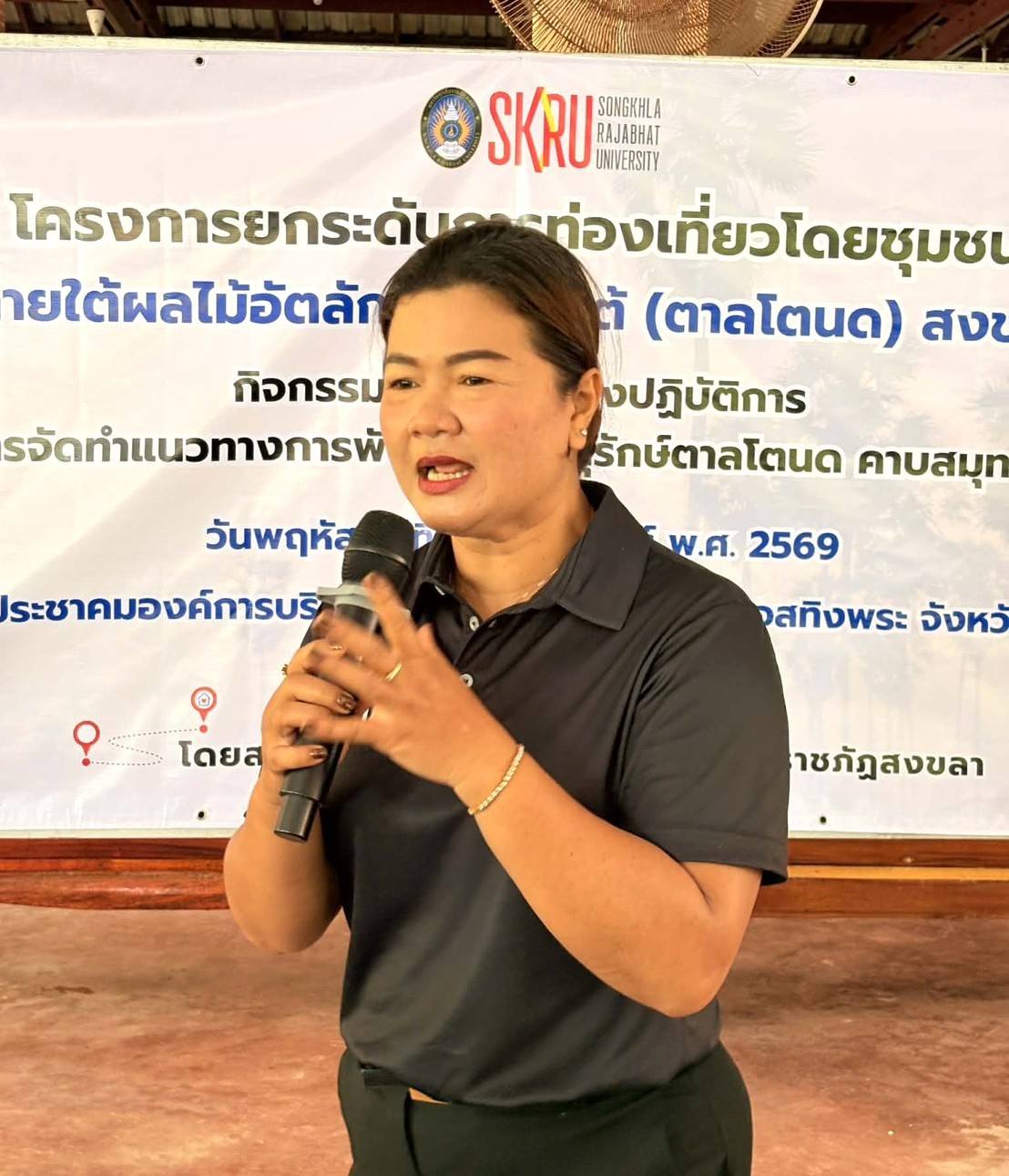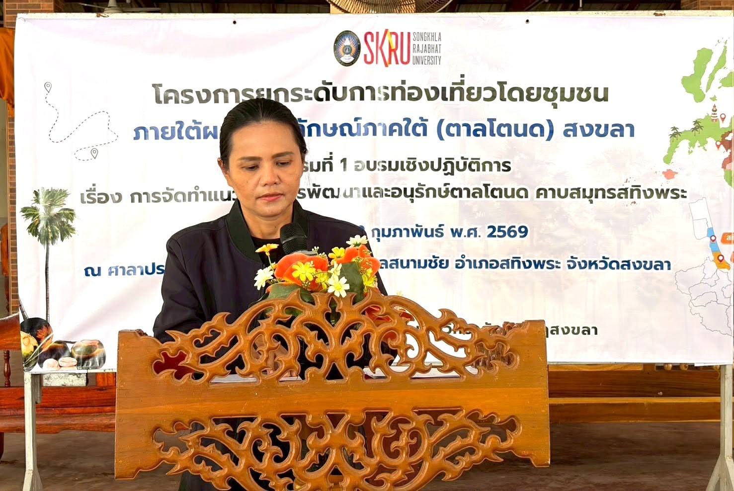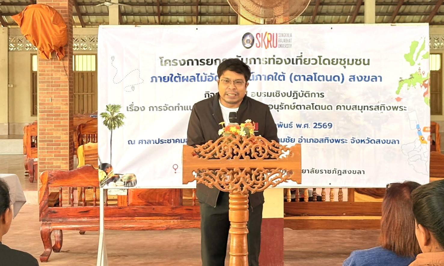 เมื่อวันที่ 12 กุมภาพันธ์ 2569 สถาบันวิจัยและพัฒนา มหาวิทยาลัยราชภัฏสงขลา (มรภ.สงขลา)  ลงพื้นที่จัดโครงการอบรมเชิงปฏิบัติการ เรื่อง “การจัดทำแนวทางการพัฒนาและอนุรักษ์ตาลโตนด คาบสมุทรสทิงพระ” ณ วัดประดิษฐ์สโมสร (วัดสนามชัยออก) ตำบลสนามชัย อำเภอสทิงพระ จังหวัดสงขลา โดย ผศ.พิเชษฐ์ จันทวี อธิการบดี มรภ.สงขลา ได้มอบหมายให้ รศ.ดร.วีระชัย แสงฉาย รองอธิการบดีฝ่ายวิชาการและวิจัย เป็นประธานกล่าวเปิดงาน พร้อมเน้นย้ำบทบาทของมหาวิทยาลัยในการบูรณาการองค์ความรู้ด้านวิชาการ งานวิจัย และการบริการวิชาการ เพื่อสนับสนุนการอนุรักษ์และต่อยอดภูมิปัญญาท้องถิ่นให้เกิดคุณค่าทางเศรษฐกิจ สังคม และวัฒนธรรม ควบคู่กับการดูแลทรัพยากรธรรมชาติอย่างสมดุล