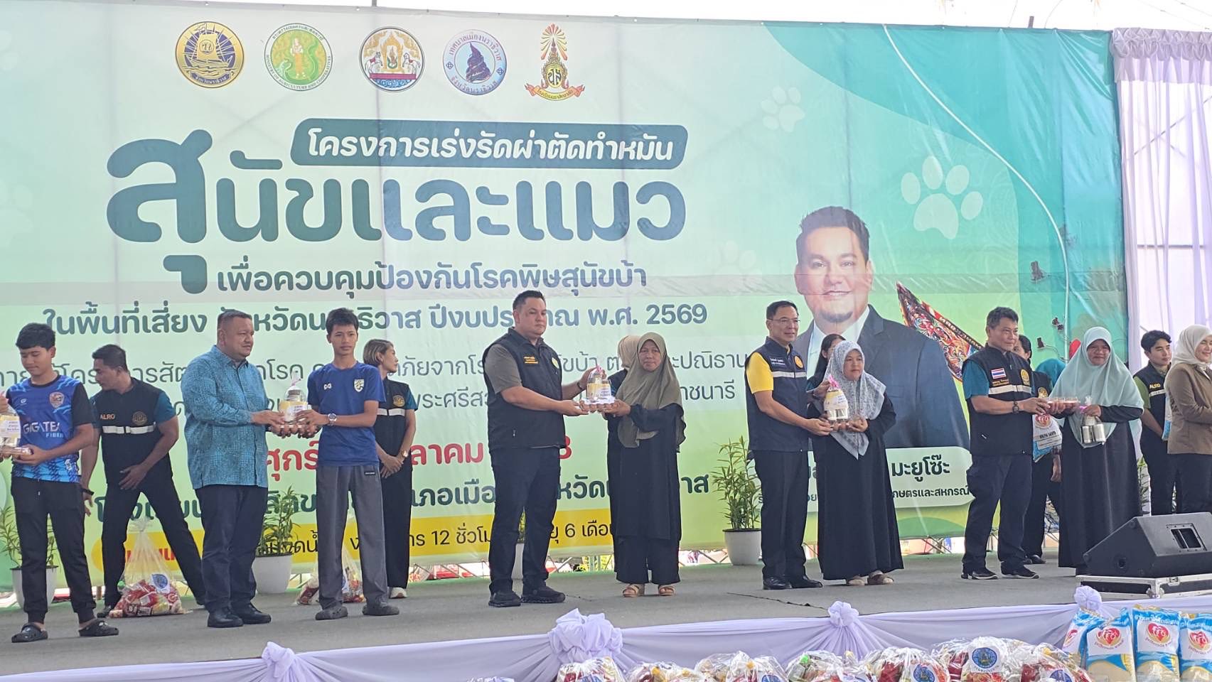 เมื่อเวลา 10.30 น. วันที่ 3 ตุลาคม 2568 ที่โรงเรียนนราสิกขาลัย ตำบลบางนาค อำเภอเมือง จังหวัดนราธิวาส นายอามินทร์ มะยูโซ๊ะ รัฐมนตรีช่วยว่าการกระทรวงเกษตรและสหกรณ์ เป็นประธาน เปิดโครงการเร่งรัดผ่าตัดทำหมันสุนัขและแมวเพื่อควบคุมป้องกันโรคพิษสุนัขบ้าในพื้นที่เสี่ยงจังหวัดนราธิวาส ปีงบประมาณ 2569 ภายใต้โครงการสัตว์ปลอดโรคคนปลอดภัยจากโรคพิษสุนัขบ้า ตามพระปณิธานศาสตราจารย์ดร.สมเด็จเจ้าฟ้าฯกรมพระศรีสวางควัฒน วรขัตติยราชนารี โดยมีนายสัตวแพทย์บุญญกฤช ปิ่นประสงค์ รองอธิบดีกรมปศุสัตว์ นายวีรพัฒน์ บุณฑริก รองผู้ว่าราชการจังหวัดนราธิวาส นายจักรพงษ์ ขานโบ ปศุสัตว์จังหวัดนราธิวาส หัวหน้าส่วนราชการ หน่วยงานที่เกี่ยวข้อง ตลอดจนประชาชนในพื้นที่เข้าร่วมพิธีอย่างพร้อมเพรียง