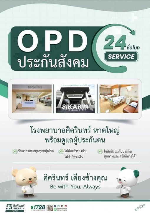 "ศิครินทร์" เคียงข้างคุณ พร้อมดูแลผู้ประกันตนทุกท่าน เจ็บป่วยไม่ต้องกังวล เข้ารับบริการที่โรงพยาบาลศิครินทร์ (OPD) ตลอด 24 ชั่วโมง 💚