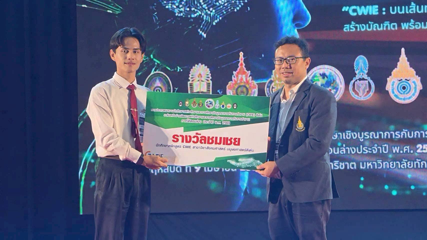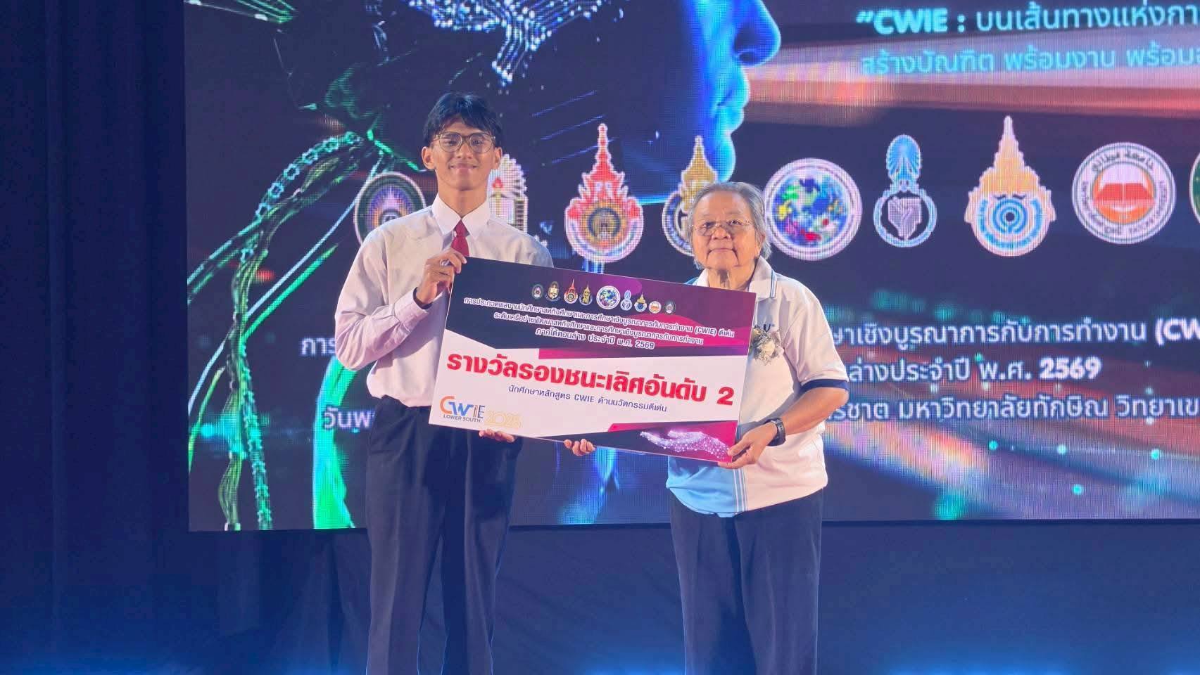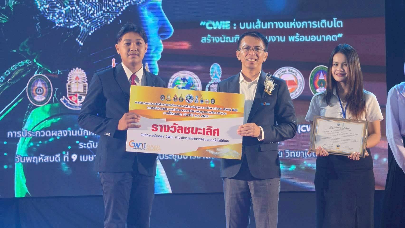 นักศึกษาสหกิจศึกษา มรภ.สงขลา กวาด 3 รางวัลเวทีประกวดผลงานสหกิจศึกษา ระดับเครือข่าย CWIE ภาคใต้ตอนล่าง ที่ ม.ทักษิณ ชนะเลิศกลุ่มสาขาวิชาวิทยาศาสตร์และเทคโนโลยีดีเด่น จากผลงาน "ผลของปริมาณความเข้มแสงต่อประสิทธิภาพการเจริญเติบโตของไก่เนื้อเพศผู้" พร้อมคว้ารางวัลรองชนะเลิศอันดับ 2 ด้านนวัตกรรมดีเด่น และรางวัลชมเชยกลุ่มสาขาวิชาสังคมศาสตร์ มนุษยศาสตร์ดีเด่น . เมื่อวันที่ 9 เมษายน 2569 ศูนย์สหกิจศึกษา สำนักส่งเสริมวิชาการและงานทะเบียน มหาวิทยาลัยราชภัฏสงขลา (มรภ.สงขลา) นำโดย ผศ.ขนิษฐา พันชูกลาง รองผู้อำนวยการสำนักส่งเสริมวิชาการและงานทะเบียน พร้อมด้วยอาจารย์ที่ปรึกษาผลงานสหกิจศึกษา และเจ้าหน้าที่ประจำศูนย์สหกิจศึกษา นำนักศึกษาที่ได้รับรางวัลจากการประกวดผลงานสหกิจศึกษาระดับมหาวิทยาลัย กลุ่มสาขาวิชาวิทยาศาสตร์และเทคโนโลยีดีเด่น กลุ่มสาขาวิชาสังคมศาสตร์ มนุษยศาสตร์ดีเด่น และด้านนวัตกรรมดีเด่น เข้าร่วมประกวดผลงานนักศึกษาสหกิจศึกษาและการศึกษาเชิงบูรณาการกับการทำงาน (CWIE) ดีเด่น ระดับเครือข่ายพัฒนาสหกิจศึกษาและการศึกษาเชิงบูรณาการกับการทำงานภาคใต้ตอนล่าง ประจำปี พ.ศ. 2569 ณ หอประชุมปาริชาต มหาวิทยาลัยทักษิณ วิทยาเขตสงขลา . ผลปรากฏว่าสามารถคว้ารางวัลจากการประกวดมาได้จำนวน 3 รางวัล ดังนี้ รางวัลชนะเลิศ กลุ่มสาขาวิชาวิทยาศาสตร์และเทคโนโลยีดีเด่น ชื่อผลงาน : ผลของปริมาณความเข้มแสงต่อประสิทธิภาพการเจริญเติบโตของไก่เนื้อเพศผู้ นำเสนอโดย นายคมกฤต สังขกุล และผู้ร่วมโครงการ 1. นางสาวตรีดารา ศิริภูวดล 2. นางสาวตัสนีม สาและ 3. นายภานุพงษ์ รัตนกูลสาขาวิชาเทคโนโลยีการผลิตสัตว์ คณะเทคโนโลยีการเกษตร อาจารย์ที่ปรึกษาผลงาน ผศ.ดร.ครวญ บัวคีรี และ อาจารย์ ดร.ปิยะนันท์ นวลหนูปล้อง สถานประกอบการปฏิบัติงานสหกิจศึกษา บริษัท เอ็ม.เค.เอส. ฟาร์ม จำกัด จังหวัดชลบุรี . ทั้งนี้ นักศึกษาที่ได้รับรางวัลชนะเลิศในระดับเครือข่าย CWIE ภาคใต้ตอนล่าง จะเข้าร่วมประกวดผลงานสหกิจศึกษในระดับชาติต่อไป . รางวัลรองชนะเลิศ อันดับ 2 ด้านนวัตกรรมดีเด่น ชื่อผลงาน : DropDetect Al ระบบวิเคราะห์ละอองน้ำยาด้วยปัญญาประดิษฐ์ นำเสนอโดย นายอิลฮาน โต๊ะกาพอ สาขาวิชาคอมพิวเตอร์ธุรกิจ คณะวิทยาการจัดการ อาจารย์ที่ปรึกษาผลงาน ผศ.วุฒิชัย อินทร์แก้ว สถานประกอบการปฏิบัติงานสหกิจศึกษา ศูนย์ควบคุมโรคติดต่อนําโดยแมลงที่ 12.2 สงขลา . รางวัลชมเชย กลุ่มสาขาวิชาสังคมศาสตร์ มนุษยศาสตร์ดีเด่น ชื่อผลงาน : Smart Web Manual: การพัฒนาเว็บไซต์คู่มือปฏิบัติงานบริการภาคพื้น เพื่อการเรียนรู้ด้วยตน