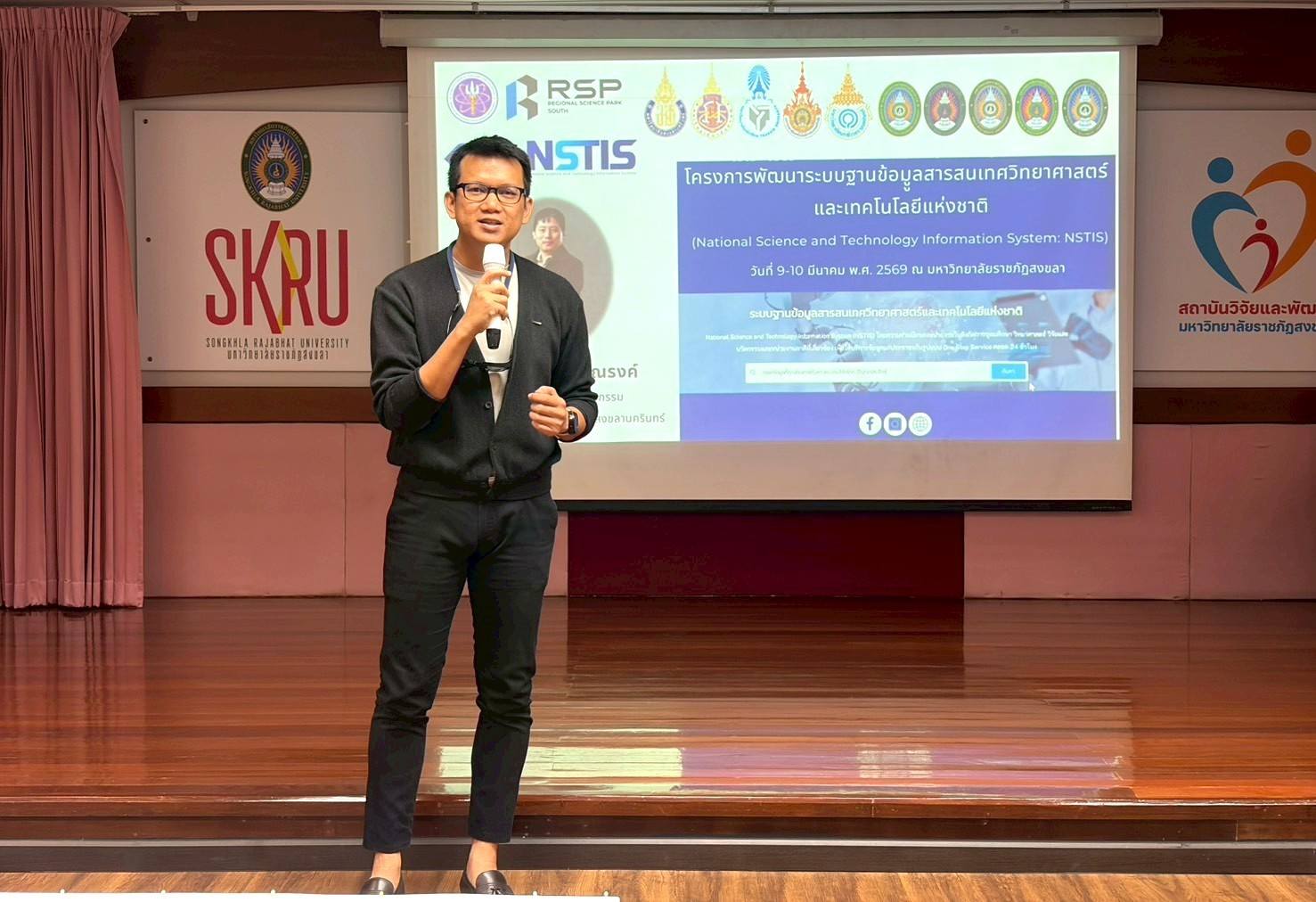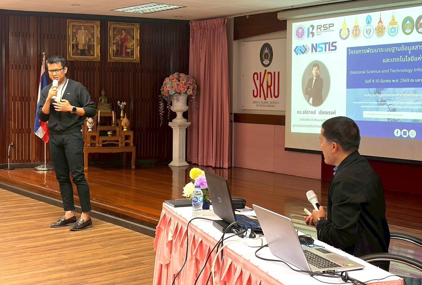เมื่อวันที่ 9 มีนาคม 2569 สถาบันวิจัยและพัฒนา มหาวิทยาลัยราชภัฏสงขลา (มรภ.สงขลา) จัดอบรมเชิงปฏิบัติการใช้งานระบบ NSTIS ภายใต้โครงการพัฒนาระบบฐานข้อมูลสารสนเทศวิทยาศาสตร์และเทคโนโลยีแห่งชาติ หรือ “NSTIS” ณ ห้องประชุม IRD.L สถาบันวิจัยและพัฒนา มรภ.สงขลา ได้รับเกียรติจาก ผศ.อภิชาติ พันชูกลาง รองผู้อำนวยการสถาบันวิจัยและพัฒนา เป็นประธานกล่าวเปิดการอบรม พร้อมกล่าวต้อนรับผู้เข้าร่วมอบรมและคณะวิทยากรจากอุทยานวิทยาศาสตร์ มหาวิทยาลัยสงขลานครินทร์ (ม.อ.) เพื่อเดินหน้ายกระดับการบริหารจัดการข้อมูลของสถาบันให้มีประสิทธิภาพสูงสุด