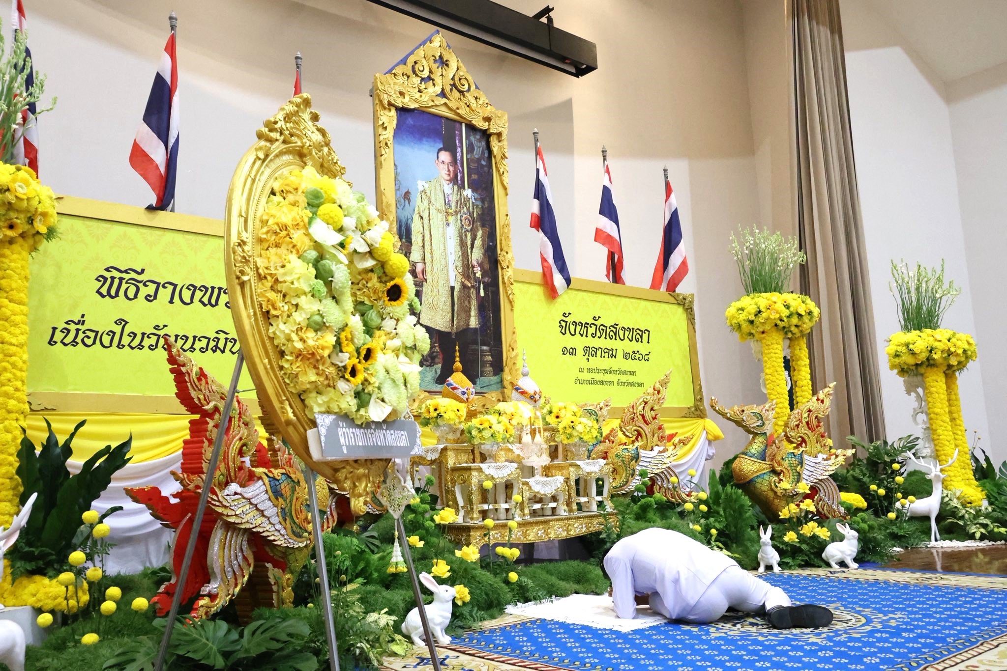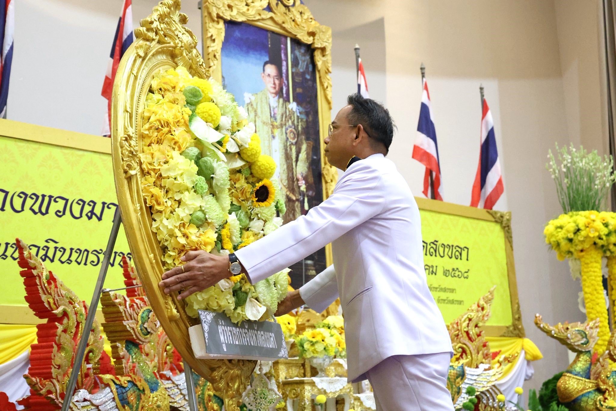 เมื่อวันที่ 13 ตุลาคม 2568 ผศ.พิเชษฐ์ จันทวี อธิการบดีมหาวิทยาลัยราชภัฏสงขลา (มรภ.สงขลา) มอบหมายให้ ผศ.กมลนาวิน อินทนูจิตร รองผู้อำนวยการสำนักศิลปะและวัฒนธรรม พร้อมด้วยบุคลากรของหน่วยงาน เป็นตัวแทนของมหาวิทยาลัยร่วมพิธีวางพวงมาลาเบื้องหน้าพระบรมฉายาลักษณ์ พระบาทสมเด็จพระบรมชนกาธิเบศร มหาภูมิพลอดุลยเดชมหาราช บรมนาถบพิตร เนื่องใน “วันนวมินทรมหาราช” ประจำปี 2568 จัดโดย จังหวัดสงขลา ณ หอประชุมศาลากลางจังหวัดสงขลา โดยมี นายโชตินรินทร์ เกิดสม ผู้ว่าราชการจังหวัดสงขลา เป็นประธานในพิธี