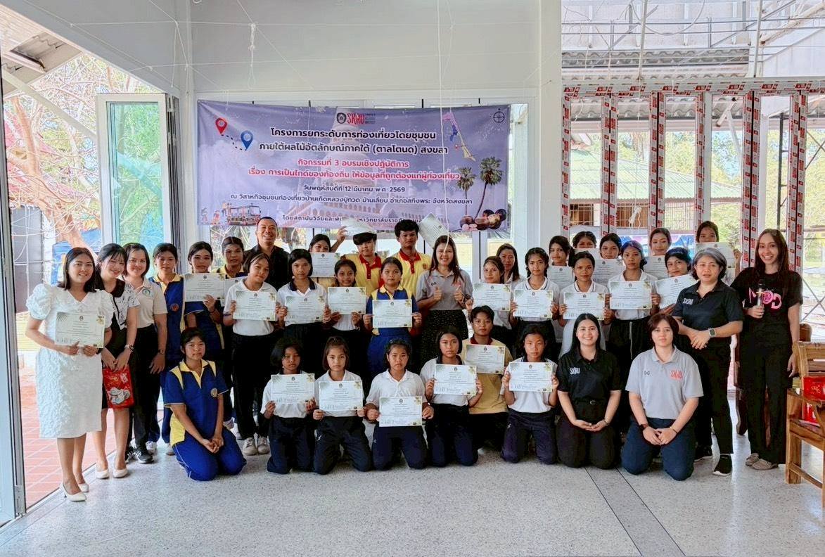 สถาบันวิจัยและพัฒนา มรภ.สงขลา จัดอบรมการเป็นไกด์ของท้องถิ่นให้ข้อมูลที่ถูกต้องฯ หนุนการท่องเที่ยวคาบสมุทรสทิงพระ จ.สงขลา ส่งเสริมการท่องเที่ยวโดยชุมชนที่สะท้อนวิถีชีวิตและภูมิปัญญาตาลโตนด ควบคู่เสริมสร้างศักยภาพคนในชุมชนให้สามารถถ่ายทอดเรื่องราวท้องถิ่นที่น่าสนใจแก่ผู้มาเยือน . เมื่อวันที่ 12 มีนาคม 2569 มหาวิทยาลัยราชภัฏสงขลา (มรภ.สงขลา) โดยสถาบันวิจัยและพัฒนา จัดกิจกรรมอบรมเชิงปฏิบัติการ เรื่อง “การเป็นไกด์ของท้องถิ่นให้ข้อมูลที่ถูกต้องแก่ผู้ท่องเที่ยว” ณ วิสาหกิจชุมชนท่องเที่ยวตามรอยบ้านเกิดหลวงปู่ทวด บ้านเลียบ อำเภอสทิงพระ จังหวัดสงขลา ซึ่งเป็นส่วนหนึ่งของโครงการยกระดับการท่องเที่ยวโดยชุมชน ภายใต้ผลไม้อัตลักษณ์ภาคใต้ (ตาลโตนด) สงขลา เพื่อเสริมสร้างศักยภาพคนในชุมชนให้สามารถถ่ายทอดเรื่องราวท้องถิ่นแก่ผู้มาเยือนได้อย่างถูกต้องและน่าสนใจ . การจัดกิจกรรมในครั้งนี้นำโดย รศ.ดร.สายฝน ไชยศรี รองผู้อำนวยการสถาบันวิจัยและพัฒนา มรภ.สงขลา พร้อมด้วยบุคลากรของสถาบันวิจัยและพัฒนา โดยมี อาจารย์ ดร.ทวีสินธุ์ ตั้งเซ่ง อาจารย์ ดร.สุวิมล บัวทอง และ อาจารย์ ดร.ปิยะนุช พรประสิทธิ์ จาก มรภ.สงขลา ร่วมเป็นวิทยากรถ่ายทอดองค์ความรู้และแนวทางการเป็นไกด์ท้องถิ่นที่มีประสิทธิภาพ ทั้งด้านทักษะการสื่อสาร การเล่าเรื่องราวของชุมชน (Storytelling) และการนำเสนอแหล่งท่องเที่ยวอย่างสร้างสรรค์ เพื่อสร้างความประทับใจให้แก่นักท่องเที่ยว . ทั้งนี้ กิจกรรมดังกล่าวมีวัตถุประสงค์เพื่อส่งเสริมการท่องเที่ยวโดยชุมชนที่สะท้อนวิถีชีวิตและภูมิปัญญาตาลโตนดของพื้นที่คาบสมุทรสทิงพระ ตลอดจนเปิดโอกาสให้คนในชุมชนมีส่วนร่วมในการพัฒนาการท่องเที่ยวของท้องถิ่นอย่างยั่งยืน นอกจากนั้น ยังเป็นการทดลองและประเมินความพร้อมของเส้นทางท่องเที่ยววิถีตาลโตนดในพื้นที่ เพื่อยกระดับการท่องเที่ยวโดยชุมชนให้มีคุณภาพ และสามารถรองรับนักท่องเที่ยวได้อย่างมีประสิทธิภาพในอนาคต . ติดตามรายละเอียดเพิ่มเติมได้ที่ https://www.skru.ac.th/th/photo/2026031603 ข้อมูล/รูป โดย สถาบันวิจัยและพัฒนา มหาวิทยาลัยราชภัฏสงขลา