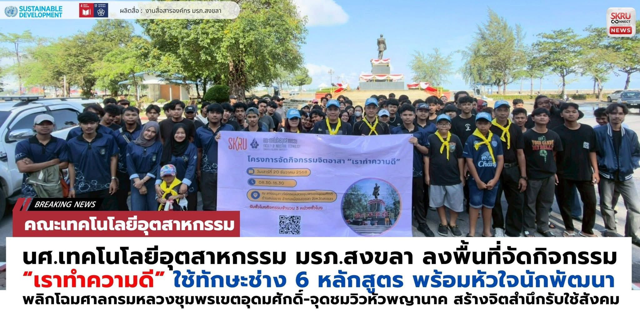 คณะเทคโนโลยีอุตสาหกรรม มรภ.สงขลา จัดกิจกรรมจิตอาสา “เราทำความดี” นำทัพนักศึกษาแสดงพลังคนรุ่นใหม่ ใช้ทักษะช่าง 6 หลักสูตร พร้อมหัวใจนักพัฒนา ร่วมปรับปรุงภูมิทัศน์ศาลกรมหลวงชุมพรเขตอุดมศักดิ์และจุดชมวิวหัวพญานาค ให้กลับมางดงามสมเกียรติ