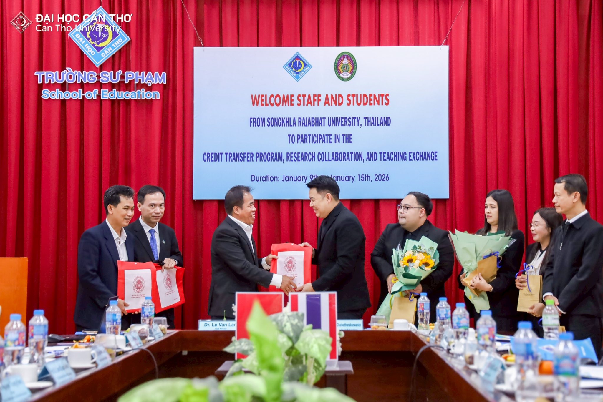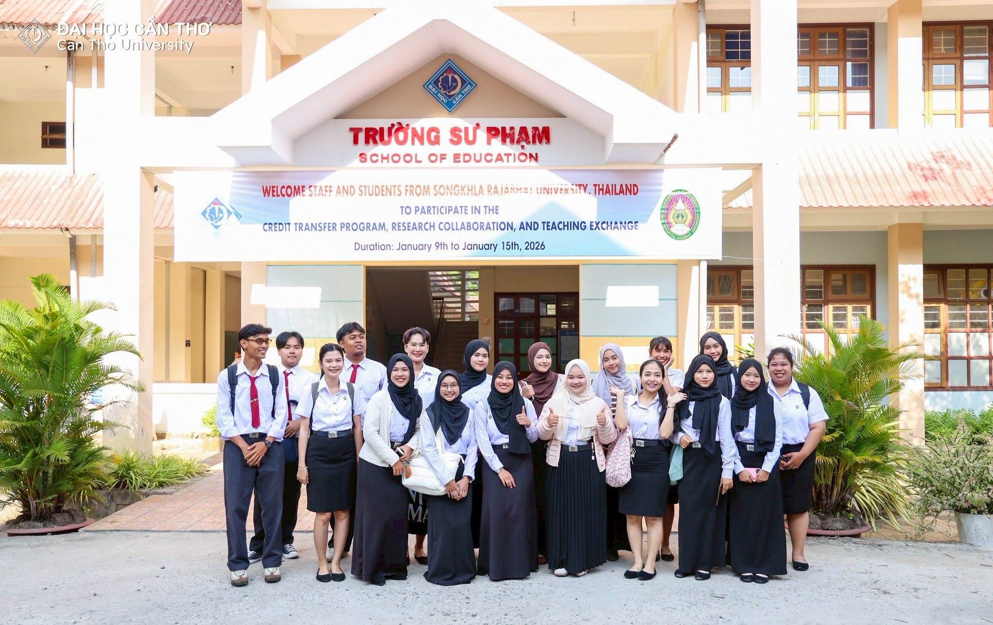 คณะครุศาสตร์ มหาวิทยาลัยราชภัฏสงขลา (มรภ.สงขลา) จัดโครงการส่งเสริมความร่วมมือการแลกเปลี่ยนการเรียนรู้ด้านครุศาสตร์ ณ Can Tho University สาธารณรัฐสังคมนิยมเวียดนาม ระหว่างวันที่ 9-15 มกราคม 2569 โดย ผศ.ดร.โสภณ ชัยวัฒนกุลวานิช คณบดีคณะครุศาสตร์ ได้นำคณาจารย์ผู้ควบคุมโครงการ อาจารย์ ดร.เอกพล ไพโรจน์ ผู้ช่วยคณบดี ผศ.ดร.จงกล บัวแก้ว ผศ.ดร.ณรงค์ กาญจนะ และ ผศ.ดร.พนัชกร พิทธิยะกุล อาจารย์คณะครุศาสตร์ พร้อมตัวแทนนักศึกษาคณะครุศาสตร์ที่ผ่านการคัดเลือกเข้าร่วมโครงการ จำนวน 18 คน เข้าพบคณะผู้บริหาร School of Education, Can Tho University นำโดย Dr. Le Van Lam, Vice Rector of Can Tho University Assoc. Prof. Huynh Anh Huy คณบดี พร้อมด้วย Assoc. Prof. Tran Van Minh Prof. Lam Quoc Anh และ Dr. Le Van Nhuong รองคณบดี ซึ่งได้ให้การต้อนรับคณะผู้มาเยือนอย่างอบอุ่น