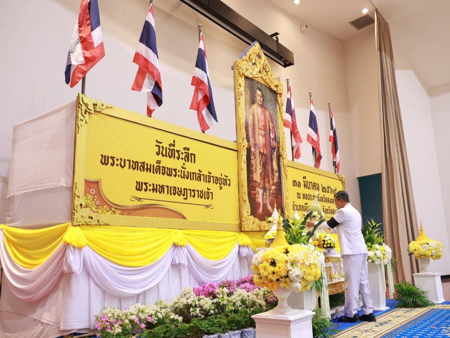 มรภ.สงขลา ร่วมพิธีวางพานพุ่มดอกไม้ถวายราชสักการะ เนื่องในวันที่ระลึกพระบาทสมเด็จพระนั่งเกล้าเจ้าอยู่หัว พระมหาเจษฎาราชเจ้า ประจำปี 2569 แสดงความจงรักภักดีและน้อมสำนึกในพระมหากรุณาธิคุณที่ทรงมีต่อพสกนิกรชาวไทย . วันที่ 31 มีนาคม 2569 ผศ.พิเชษฐ์ จันทวี อธิการบดีมหาวิทยาลัยราชภัฏสงขลา (มรภ.สงขลา) มอบหมายให้ ผศ.ดร.กันตภณ มะหาหมัด รองอธิการบดีฝ่ายบริหารและพัฒนาหน่วยงาน เป็นตัวแทนของมหาวิทยาลัยร่วมวางพานพุ่มดอกไม้ถวายราชสักการะ เนื่องใน “วันที่ระลึกพระบาทสมเด็จพระนั่งเกล้าเจ้าอยู่หัว พระมหาเจษฎาราชเจ้า” ประจำปี 2569 ณ หอประชุมจังหวัดสงขลา อำเภอเมืองสงขลา จังหวัดสงขลา โดยมี นายรัฐศาสตร์ ชิดชู ผู้ว่าราชการจังหวัดสงขลา เป็นประธานในพิธี . ทั้งนี้ คณะรัฐมนตรีได้มีมติเมื่อวันที่ 17 กุมภาพันธ์ 2541 กำหนดให้วันที่ 31 มีนาคม ของทุกปี เป็นวันที่ระลึกพระบาทสมเด็จพระนั่งเกล้าเจ้าอยู่หัว พระมหาเจษฎาราชเจ้า จังหวัดสงขลาจึงได้จัดงานรัฐพิธีถวายเครื่องราชสักการะ โดยมีข้าราชการชั้นผู้ใหญ่ ผู้แทนศาล ทหาร ตำรวจ หัวหน้าส่วนราชการ นายอำเภอ ตลอดจนหน่วยงานทุกภาคส่วน เข้าร่วมพิธีโดยพร้อมเพรียงกัน เพื่อแสดงความจงรักภักดีและน้อมสำนึกในพระมหากรุณาธิคุณอันหาที่สุดมิได้ของพระบาทสมเด็จพระนั่งเกล้าเจ้าอยู่หัว พระมหาเจษฎาราชเจ้า ที่ทรงมีต่อพสกนิกรชาวไทย . ข้อมูล/ภาพ งานสื่อสารองค์กร และ เพจสำนักงานประชาสัมพันธ์จังหวัดสงขลา