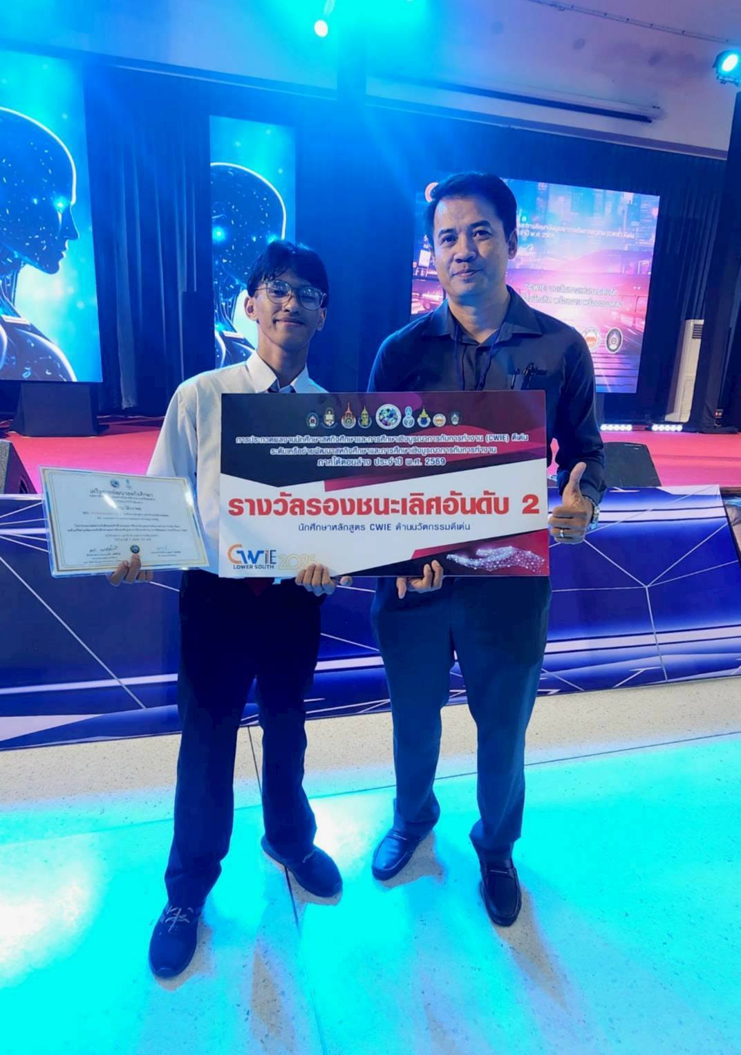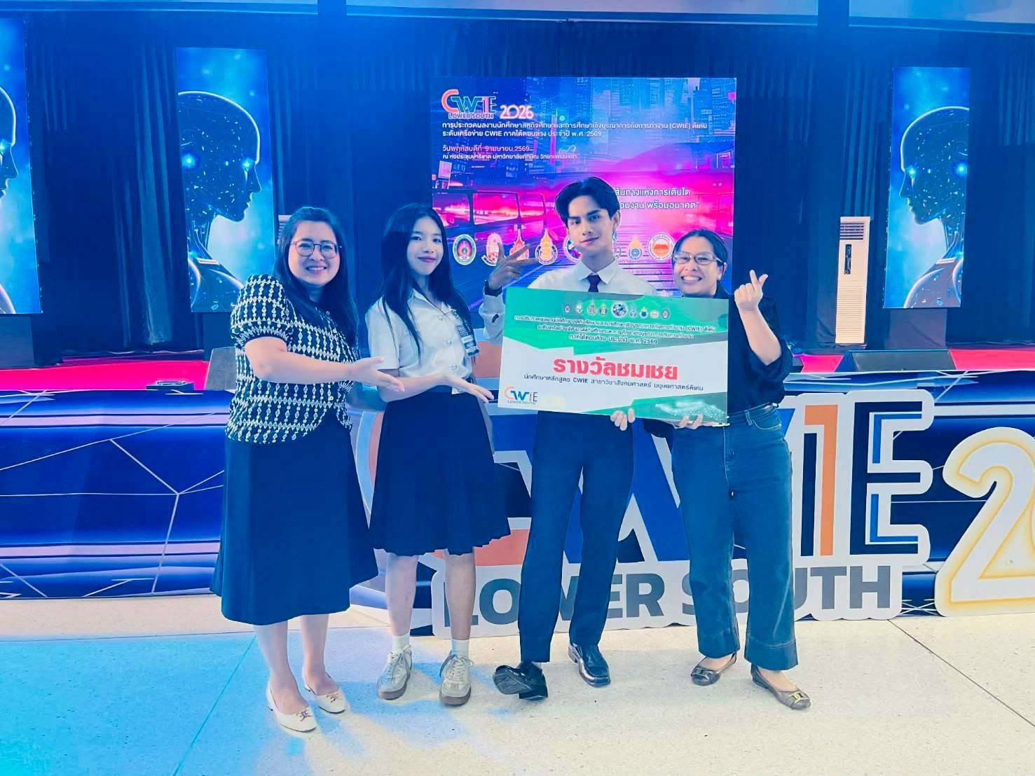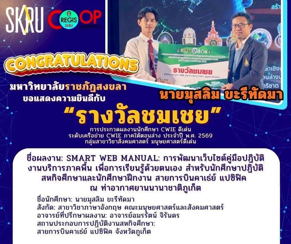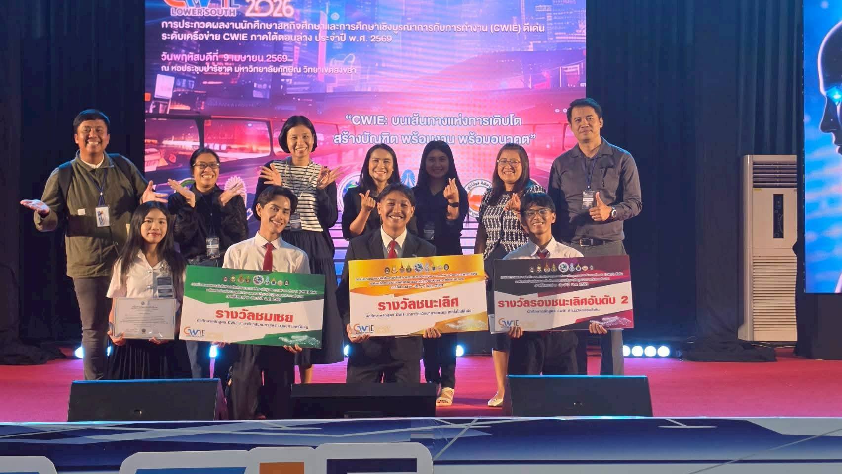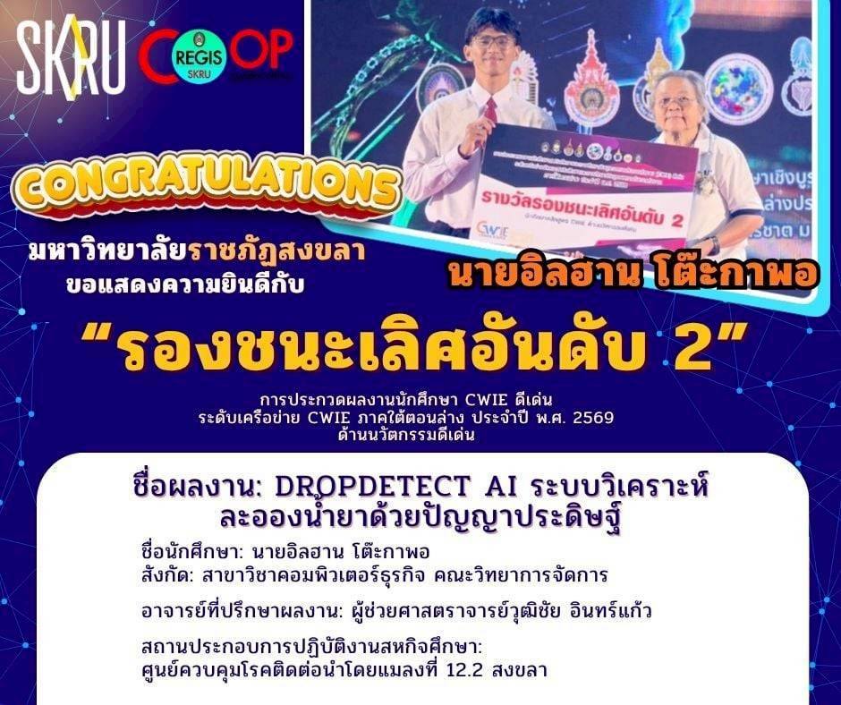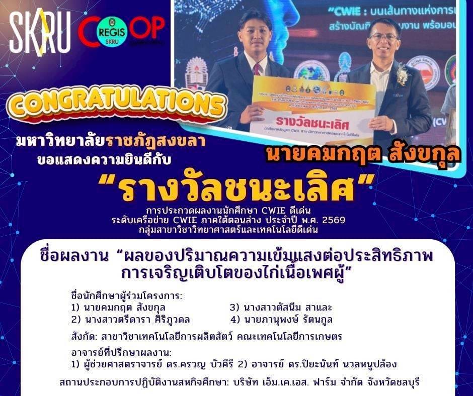 นักศึกษาสหกิจศึกษา มรภ.สงขลา กวาด 3 รางวัลเวทีประกวดผลงานสหกิจศึกษา ระดับเครือข่าย CWIE ภาคใต้ตอนล่าง ที่ ม.ทักษิณ ชนะเลิศกลุ่มสาขาวิชาวิทยาศาสตร์และเทคโนโลยีดีเด่น จากผลงาน "ผลของปริมาณความเข้มแสงต่อประสิทธิภาพการเจริญเติบโตของไก่เนื้อเพศผู้" พร้อมคว้ารางวัลรองชนะเลิศอันดับ 2 ด้านนวัตกรรมดีเด่น และรางวัลชมเชยกลุ่มสาขาวิชาสังคมศาสตร์ มนุษยศาสตร์ดีเด่น . เมื่อวันที่ 9 เมษายน 2569 ศูนย์สหกิจศึกษา สำนักส่งเสริมวิชาการและงานทะเบียน มหาวิทยาลัยราชภัฏสงขลา (มรภ.สงขลา) นำโดย ผศ.ขนิษฐา พันชูกลาง รองผู้อำนวยการสำนักส่งเสริมวิชาการและงานทะเบียน พร้อมด้วยอาจารย์ที่ปรึกษาผลงานสหกิจศึกษา และเจ้าหน้าที่ประจำศูนย์สหกิจศึกษา นำนักศึกษาที่ได้รับรางวัลจากการประกวดผลงานสหกิจศึกษาระดับมหาวิทยาลัย กลุ่มสาขาวิชาวิทยาศาสตร์และเทคโนโลยีดีเด่น กลุ่มสาขาวิชาสังคมศาสตร์ มนุษยศาสตร์ดีเด่น และด้านนวัตกรรมดีเด่น เข้าร่วมประกวดผลงานนักศึกษาสหกิจศึกษาและการศึกษาเชิงบูรณาการกับการทำงาน (CWIE) ดีเด่น ระดับเครือข่ายพัฒนาสหกิจศึกษาและการศึกษาเชิงบูรณาการกับการทำงานภาคใต้ตอนล่าง ประจำปี พ.ศ. 2569 ณ หอประชุมปาริชาต มหาวิทยาลัยทักษิณ วิทยาเขตสงขลา . ผลปรากฏว่าสามารถคว้ารางวัลจากการประกวดมาได้จำนวน 3 รางวัล ดังนี้ รางวัลชนะเลิศ กลุ่มสาขาวิชาวิทยาศาสตร์และเทคโนโลยีดีเด่น ชื่อผลงาน : ผลของปริมาณความเข้มแสงต่อประสิทธิภาพการเจริญเติบโตของไก่เนื้อเพศผู้ นำเสนอโดย นายคมกฤต สังขกุล และผู้ร่วมโครงการ 1. นางสาวตรีดารา ศิริภูวดล 2. นางสาวตัสนีม สาและ 3. นายภานุพงษ์ รัตนกูลสาขาวิชาเทคโนโลยีการผลิตสัตว์ คณะเทคโนโลยีการเกษตร อาจารย์ที่ปรึกษาผลงาน ผศ.ดร.ครวญ บัวคีรี และ อาจารย์ ดร.ปิยะนันท์ นวลหนูปล้อง สถานประกอบการปฏิบัติงานสหกิจศึกษา บริษัท เอ็ม.เค.เอส. ฟาร์ม จำกัด จังหวัดชลบุรี . ทั้งนี้ นักศึกษาที่ได้รับรางวัลชนะเลิศในระดับเครือข่าย CWIE ภาคใต้ตอนล่าง จะเข้าร่วมประกวดผลงานสหกิจศึกษในระดับชาติต่อไป . รางวัลรองชนะเลิศ อันดับ 2 ด้านนวัตกรรมดีเด่น ชื่อผลงาน : DropDetect Al ระบบวิเคราะห์ละอองน้ำยาด้วยปัญญาประดิษฐ์ นำเสนอโดย นายอิลฮาน โต๊ะกาพอ สาขาวิชาคอมพิวเตอร์ธุรกิจ คณะวิทยาการจัดการ อาจารย์ที่ปรึกษาผลงาน ผศ.วุฒิชัย อินทร์แก้ว สถานประกอบการปฏิบัติงานสหกิจศึกษา ศูนย์ควบคุมโรคติดต่อนําโดยแมลงที่ 12.2 สงขลา . รางวัลชมเชย กลุ่มสาขาวิชาสังคมศาสตร์ มนุษยศาสตร์ดีเด่น ชื่อผลงาน : Smart Web Manual: การพัฒนาเว็บไซต์คู่มือปฏิบัติงานบริการภาคพื้น เพื่อการเรียนรู้ด้วยตน